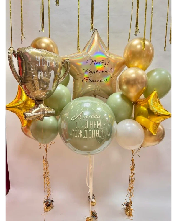- Крупный размер — около 60 см. Стоимость составляет примерно 2200 рублей. Этот размер позволяет размещать большие надписи, фотографии, использовать широкие ленты, фатин и мини-фигурки.